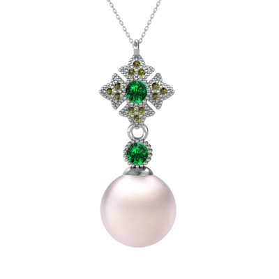 Pembe inci, yeşil kuvars ve peridot 8 ayar beyaz altın kolye (40 cm gümüş rolo zincir)
