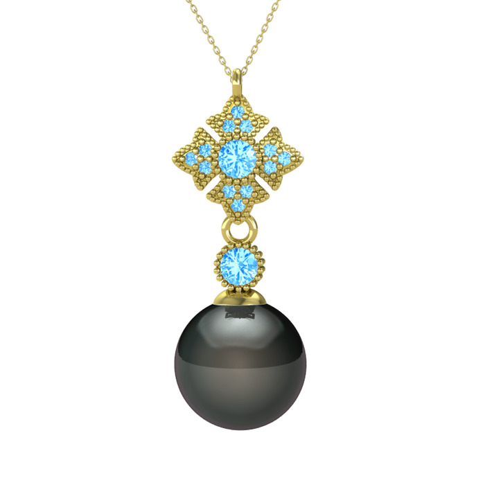 Siyah inci ve akuamarin 8 ayar altın kolye (40 cm altın rolo zincir)
