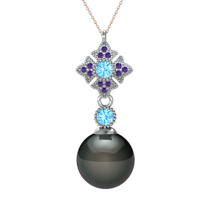Siyah inci, akuamarin ve ametist 14 ayar beyaz altın kolye (40 cm rose altın rolo zincir)