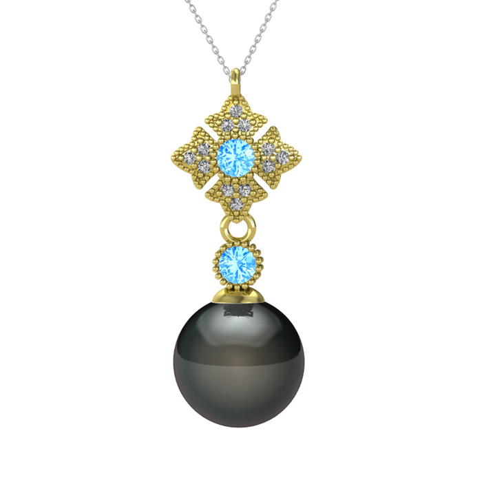 Siyah inci, akuamarin ve beyaz zirkon 14 ayar altın kolye (40 cm beyaz altın rolo zincir)