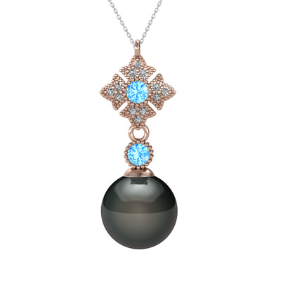 Siyah inci, akuamarin ve beyaz zirkon 925 ayar rose altın kaplama gümüş kolye (40 cm beyaz altın rolo zincir)