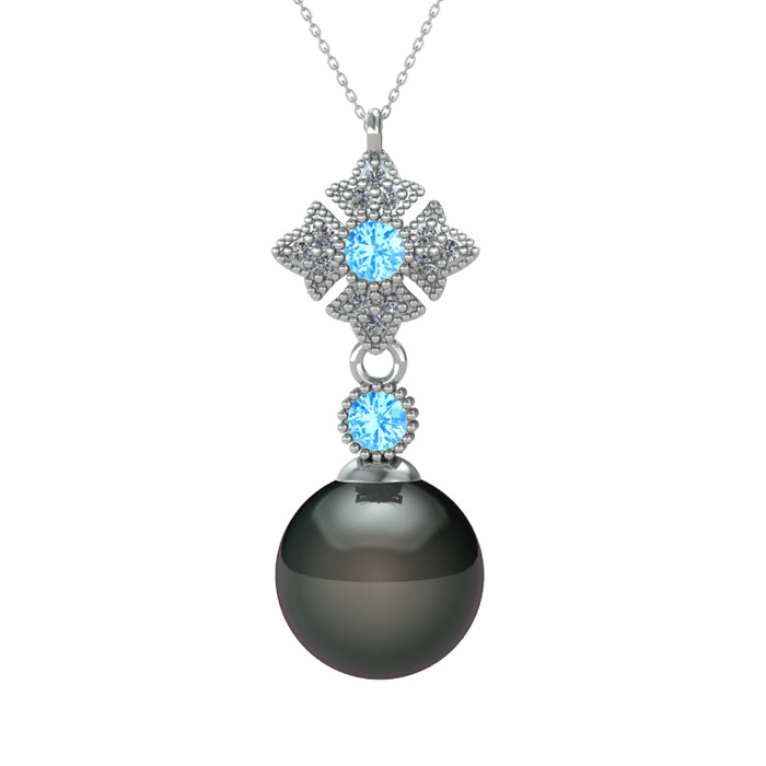 Siyah inci, akuamarin ve pırlanta 14 ayar beyaz altın kolye (0.1056 karat, 40 cm beyaz altın rolo zincir)
