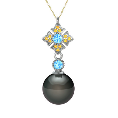 Siyah inci, akuamarin ve sitrin 925 ayar gümüş kolye (40 cm altın rolo zincir)