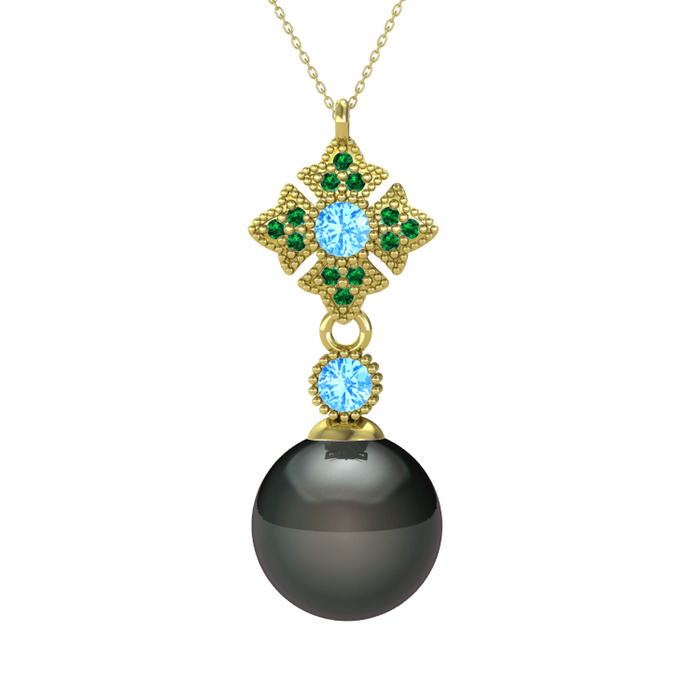 Siyah inci, akuamarin ve yeşil kuvars 14 ayar altın kolye (40 cm gümüş rolo zincir)
