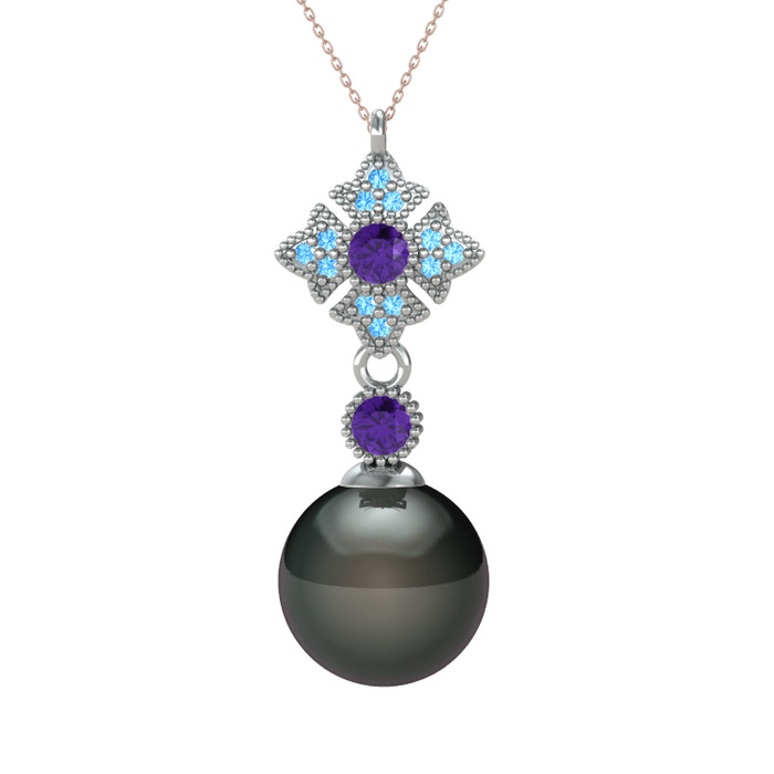 Siyah inci, ametist ve akuamarin 8 ayar beyaz altın kolye (40 cm rose altın rolo zincir)