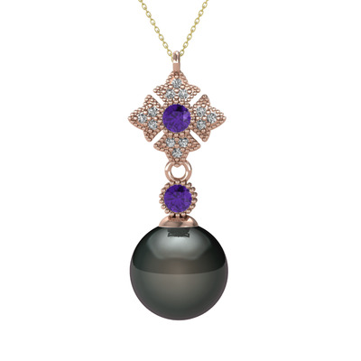 Siyah inci, ametist ve beyaz zirkon 14 ayar rose altın kolye (40 cm gümüş rolo zincir)