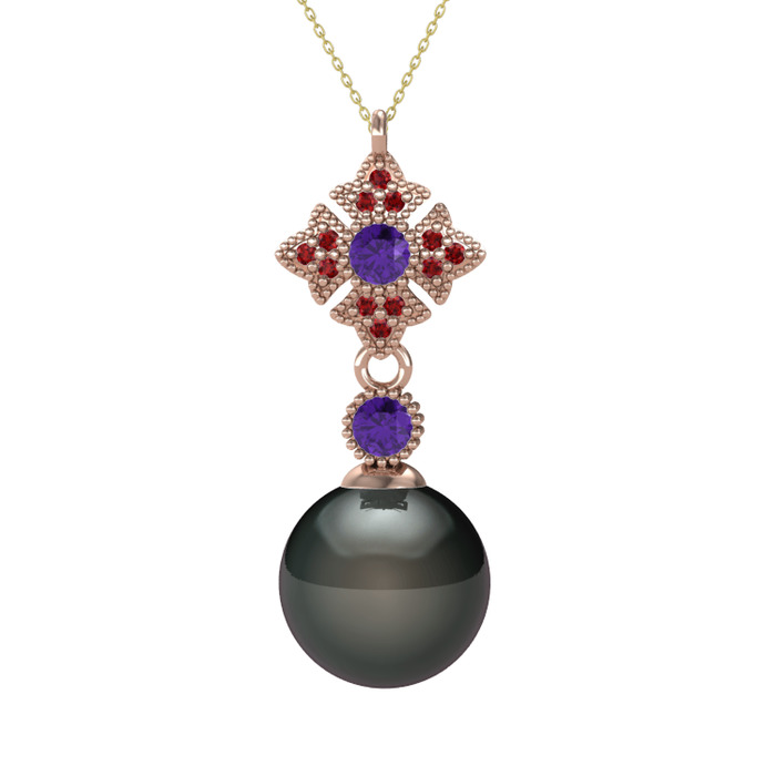Siyah inci, ametist ve garnet 8 ayar rose altın kolye (40 cm gümüş rolo zincir)