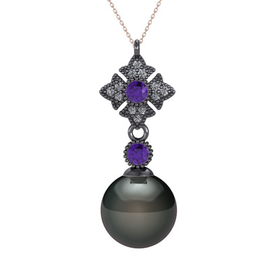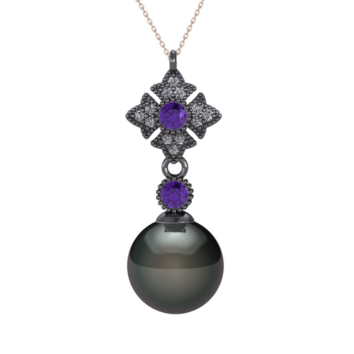 Siyah inci, ametist ve pırlanta 925 ayar siyah rodyum kaplama gümüş kolye (0.1056 karat, 40 cm gümüş rolo zincir)