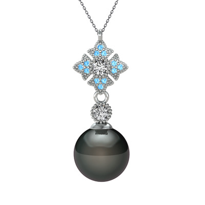 Siyah inci, beyaz zirkon ve akuamarin 8 ayar beyaz altın kolye (40 cm gümüş rolo zincir)