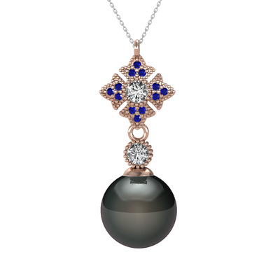 Siyah inci, beyaz zirkon ve lab safir 8 ayar rose altın kolye (40 cm gümüş rolo zincir)