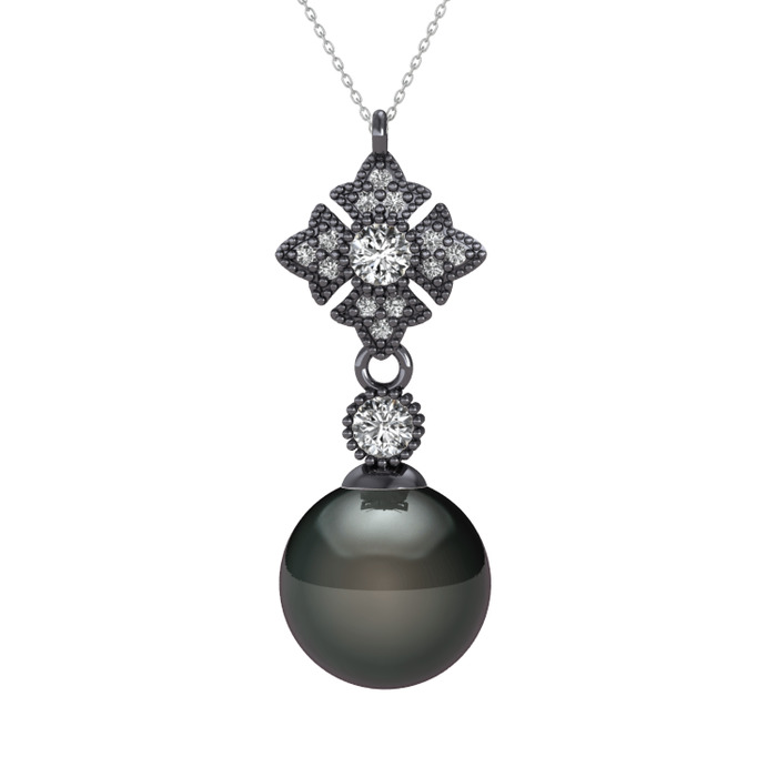 Siyah inci ve beyaz zirkon 925 ayar siyah rodyum kaplama gümüş kolye (40 cm beyaz altın rolo zincir)