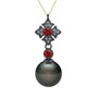 Siyah inci, garnet ve pırlanta 925 ayar siyah rodyum kaplama gümüş kolye (0.1056 karat, 40 cm altın rolo zincir)