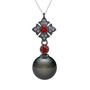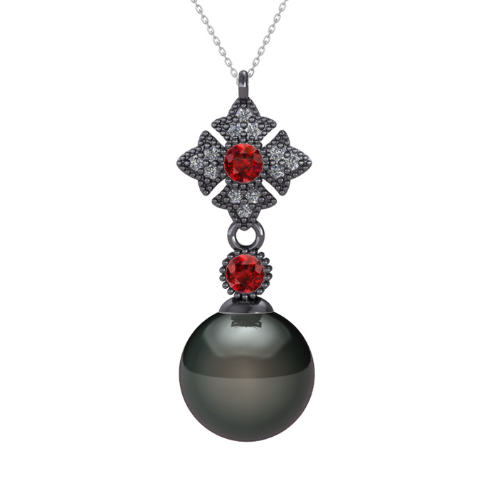 Siyah inci, garnet ve pırlanta 925 ayar siyah rodyum kaplama gümüş kolye (0.1056 karat, 40 cm beyaz altın rolo zincir)