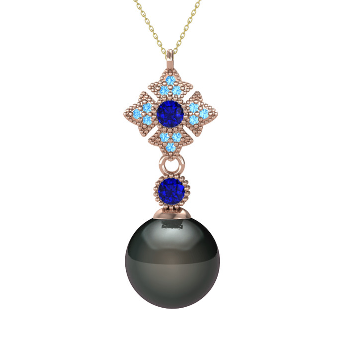 Siyah inci, lab safir ve akuamarin 14 ayar rose altın kolye (40 cm gümüş rolo zincir)