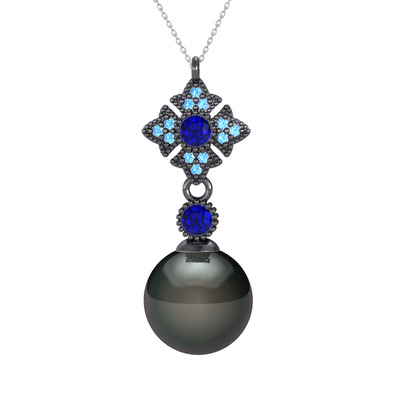 Siyah inci, lab safir ve akuamarin 925 ayar siyah rodyum kaplama gümüş kolye (40 cm gümüş rolo zincir)