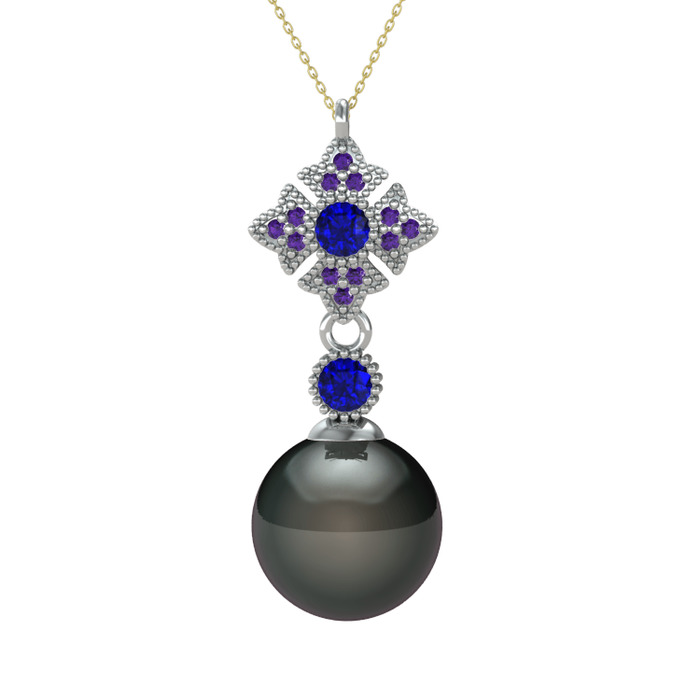 Siyah inci, lab safir ve ametist 8 ayar beyaz altın kolye (40 cm altın rolo zincir)