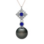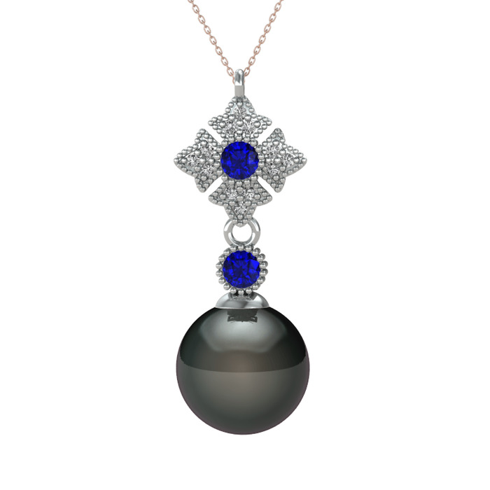 Siyah inci, lab safir ve beyaz zirkon 8 ayar beyaz altın kolye (40 cm rose altın rolo zincir)