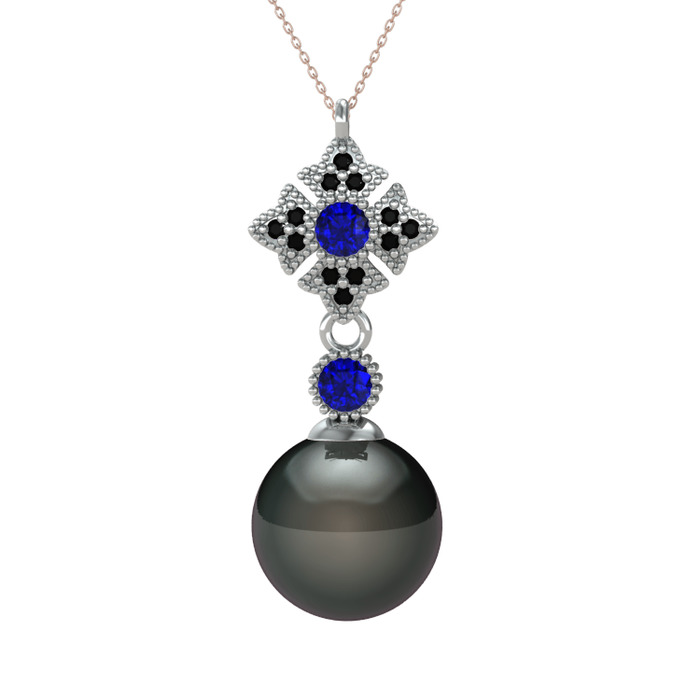 Siyah inci, lab safir ve siyah zirkon 14 ayar beyaz altın kolye (40 cm rose altın rolo zincir)