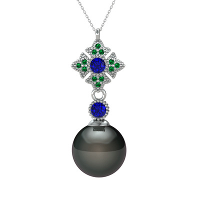 Siyah inci, lab safir ve yeşil kuvars 14 ayar beyaz altın kolye (40 cm beyaz altın rolo zincir)