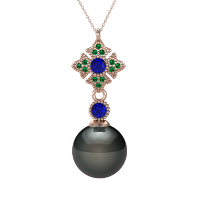 Siyah inci, lab safir ve yeşil kuvars 925 ayar rose altın kaplama gümüş kolye (40 cm rose altın rolo zincir)
