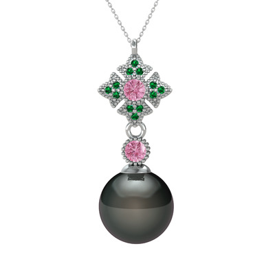 Siyah inci, pembe kuvars ve yeşil kuvars 14 ayar beyaz altın kolye (40 cm beyaz altın rolo zincir)