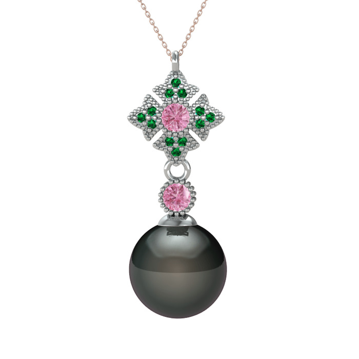 Siyah inci, pembe kuvars ve yeşil kuvars 14 ayar beyaz altın kolye (40 cm rose altın rolo zincir)