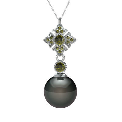 Siyah inci ve peridot 14 ayar beyaz altın kolye (40 cm gümüş rolo zincir)