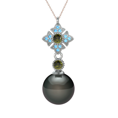 Siyah inci, peridot ve akuamarin 925 ayar gümüş kolye (40 cm gümüş rolo zincir)