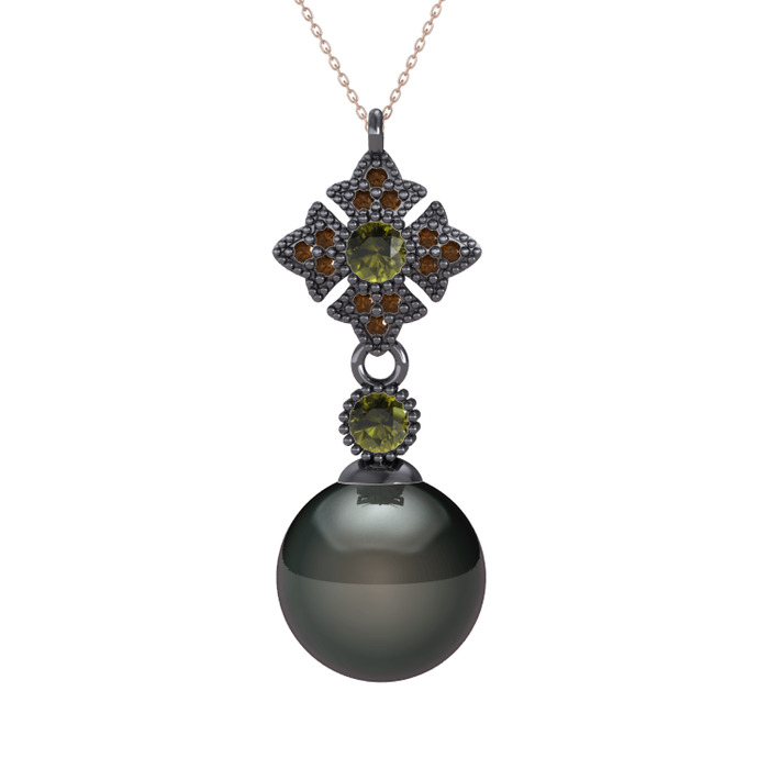 Siyah inci, peridot ve dumanlı kuvars 925 ayar siyah rodyum kaplama gümüş kolye (40 cm rose altın rolo zincir)