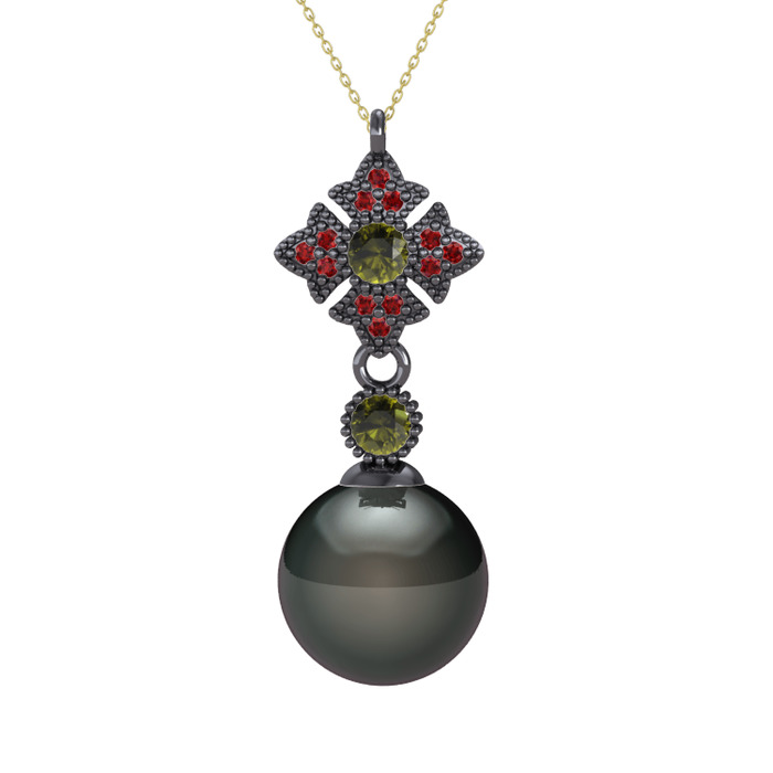 Siyah inci, peridot ve garnet 925 ayar siyah rodyum kaplama gümüş kolye (40 cm altın rolo zincir)