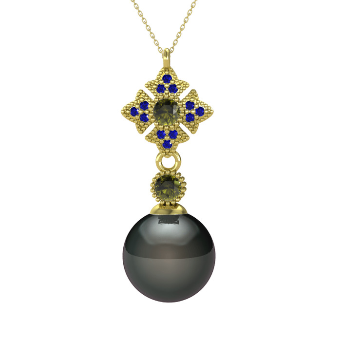 Siyah inci, peridot ve lab safir 925 ayar altın kaplama gümüş kolye (40 cm altın rolo zincir)