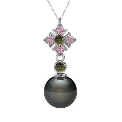 Siyah inci, peridot ve pembe kuvars 8 ayar beyaz altın kolye (40 cm gümüş rolo zincir)