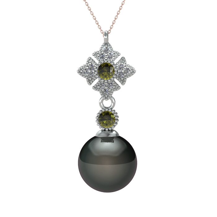 Siyah inci, peridot ve pırlanta 14 ayar beyaz altın kolye (0.1056 karat, 40 cm rose altın rolo zincir)