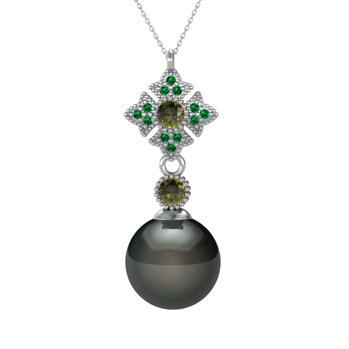 Siyah inci, peridot ve yeşil kuvars 14 ayar beyaz altın kolye (40 cm beyaz altın rolo zincir)
