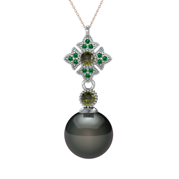 Siyah inci, peridot ve yeşil kuvars 14 ayar beyaz altın kolye (40 cm rose altın rolo zincir)