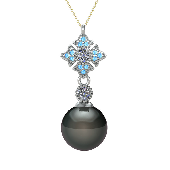 Siyah inci, pırlanta ve akuamarin 925 ayar gümüş kolye (0.22 karat, 40 cm gümüş rolo zincir)