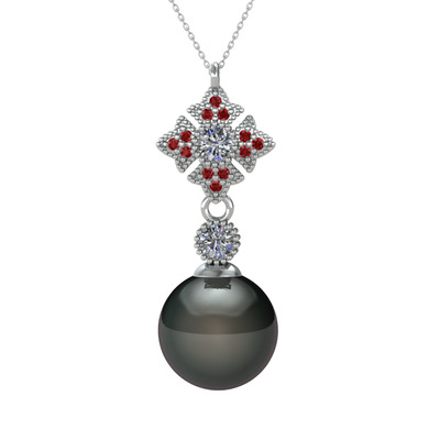 Siyah inci, pırlanta ve garnet 14 ayar beyaz altın kolye (0.22 karat, 40 cm beyaz altın rolo zincir)