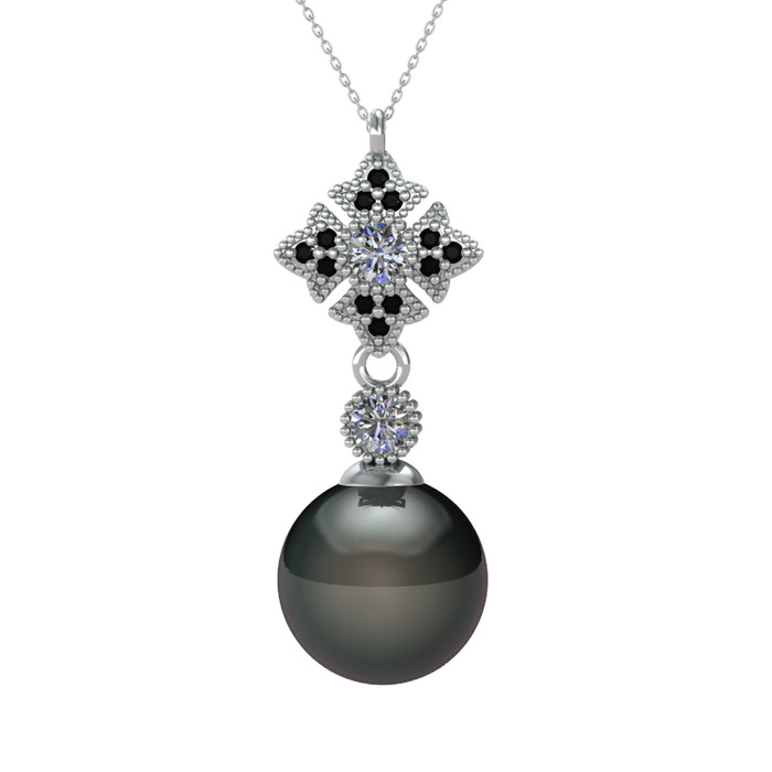 Siyah inci, pırlanta ve siyah zirkon 925 ayar gümüş kolye (0.22 karat, 40 cm beyaz altın rolo zincir)