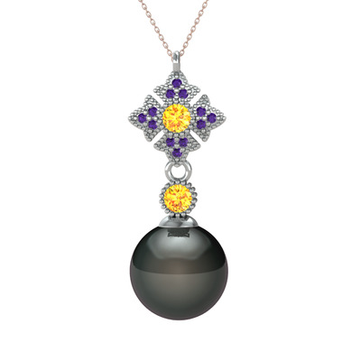 Siyah inci, sitrin ve ametist 14 ayar beyaz altın kolye (40 cm rose altın rolo zincir)