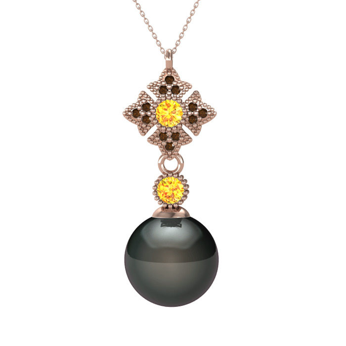 Siyah inci, sitrin ve dumanlı kuvars 14 ayar rose altın kolye (40 cm gümüş rolo zincir)
