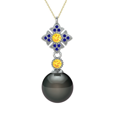 Siyah inci, sitrin ve lab safir 925 ayar gümüş kolye (40 cm altın rolo zincir)