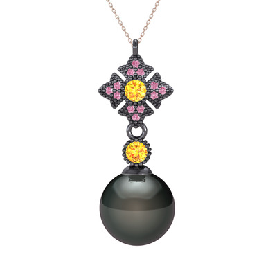 Siyah inci, sitrin ve pembe kuvars 925 ayar siyah rodyum kaplama gümüş kolye (40 cm rose altın rolo zincir)