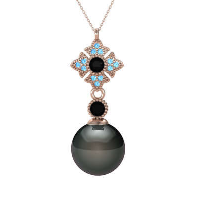 Siyah inci, siyah zirkon ve akuamarin 8 ayar rose altın kolye (40 cm rose altın rolo zincir)