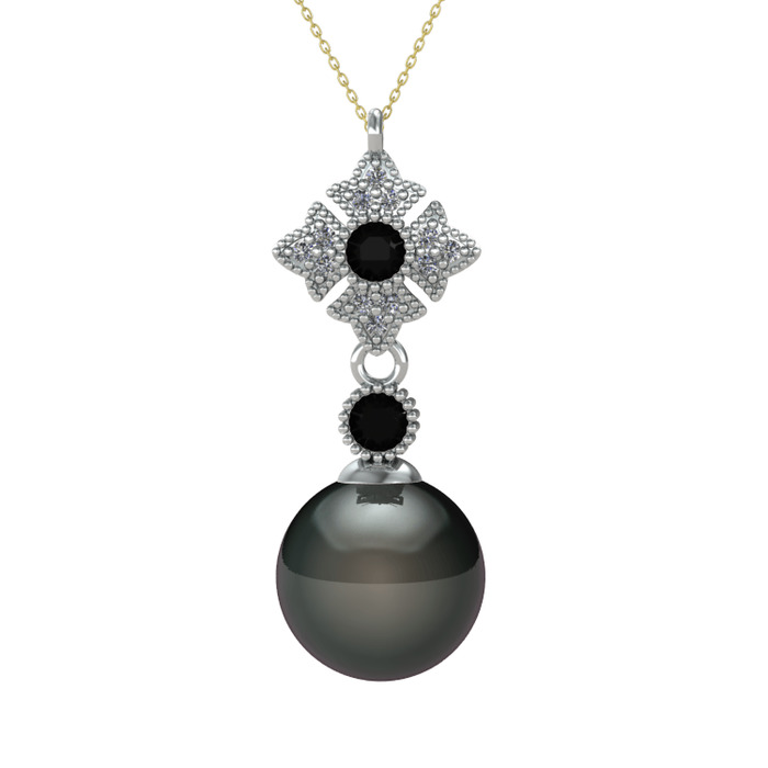 Siyah inci, siyah zirkon ve pırlanta 8 ayar beyaz altın kolye (0.1056 karat, 40 cm altın rolo zincir)