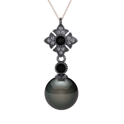 Siyah inci, siyah zirkon ve pırlanta 925 ayar siyah rodyum kaplama gümüş kolye (0.1056 karat, 40 cm rose altın rolo zincir)