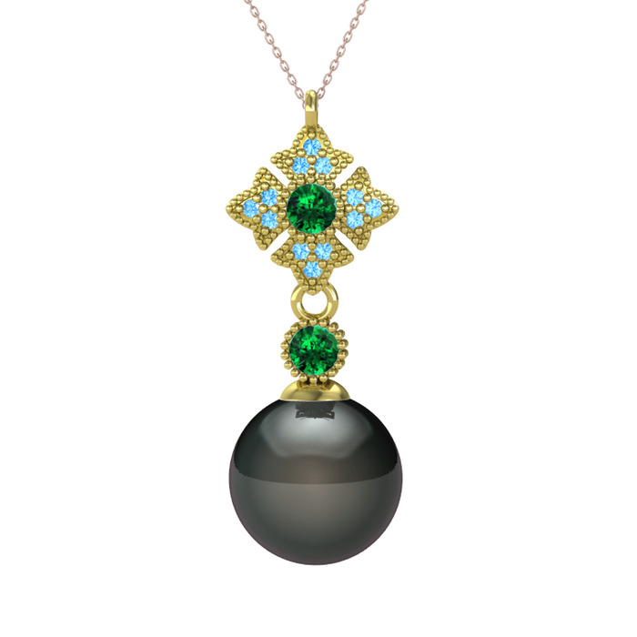 Siyah inci, yeşil kuvars ve akuamarin 8 ayar altın kolye (40 cm rose altın rolo zincir)