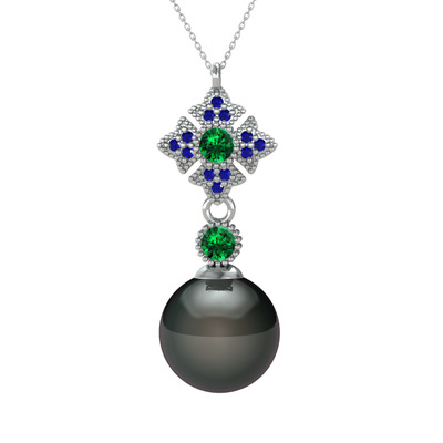 Siyah inci, yeşil kuvars ve lab safir 14 ayar beyaz altın kolye (40 cm beyaz altın rolo zincir)