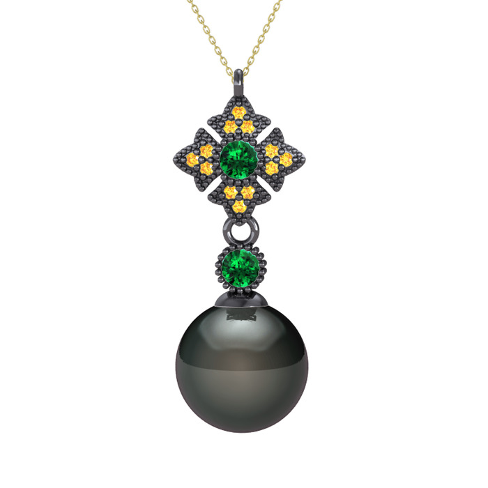 Siyah inci, yeşil kuvars ve sitrin 925 ayar siyah rodyum kaplama gümüş kolye (40 cm altın rolo zincir)