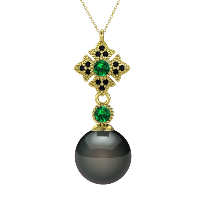 Siyah inci, yeşil kuvars ve siyah zirkon 14 ayar altın kolye (40 cm altın rolo zincir)