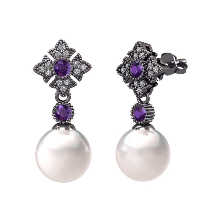 Inci, ametist ve beyaz zirkon 925 ayar siyah rodyum kaplama gümüş küpe